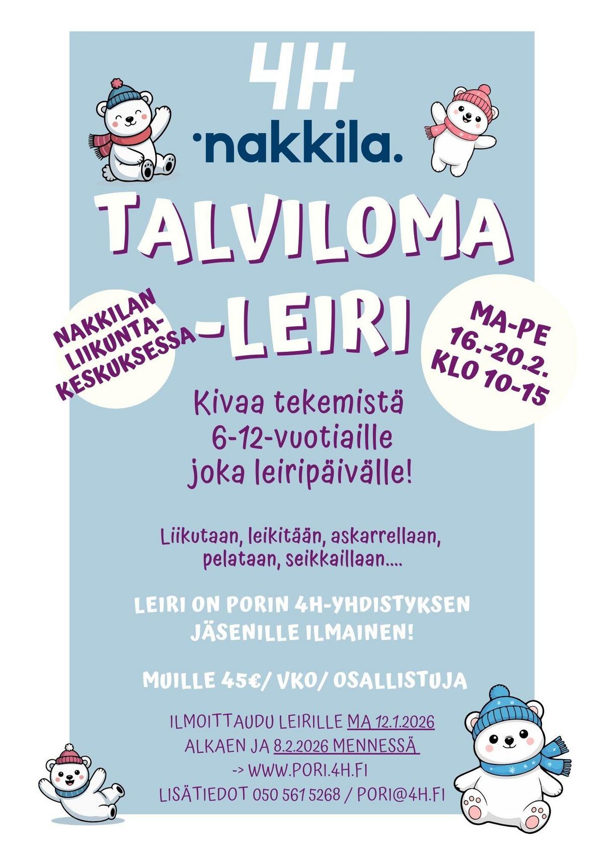 Porin 4H-yhdistys järjestää yhdessä Nakkilan kunnan kanssa talvilomaleirin viikolla 8 alakoululaisille.
