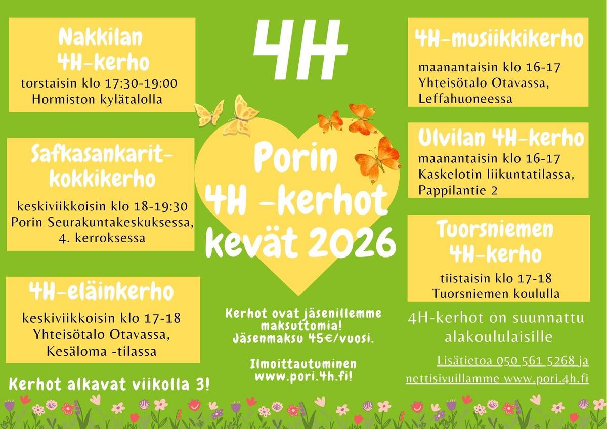 Klubi on avoin kaikille 4H-nuorille. Ohjelma suunnitellaan yhdessä ja osallistujat voivat olla ympäri Suomea, välillä mukana on ollut myös 4H-nuoria ulkomailta, kuten Taiwanista ja Saksasta. Klubi suunittelee kokoontumisajat, -paikat ja teemat yhdessä. Viimeksi klubi on mm. käynyt pakohuonepelissä sekä geokätköilemässä ja syömässä. Jos kiinnostuit, ota yhteyttä sähköpostilla pori@4h.fi.